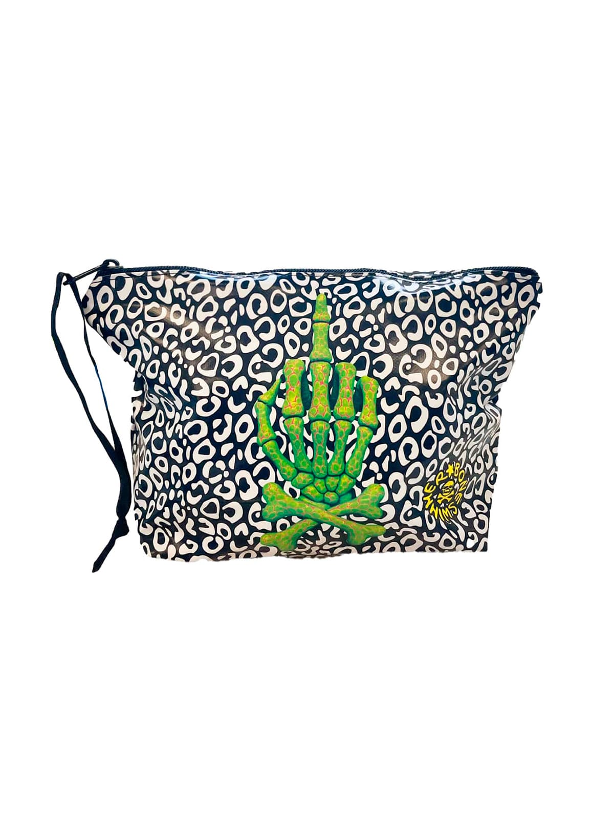 Estilo: este neceser en PVC suave de fuerte impacto visual para quien quiere destacar presenta un fondo animal blanco y negro, enriquecido con una gran gráfica central que muestra una mano esquelética verde fluorescente en posición irreverente. El efecto cromático neón verde ácido sobre el patrón de manchas crea un contraste óptico que evoca las influencias pop.
