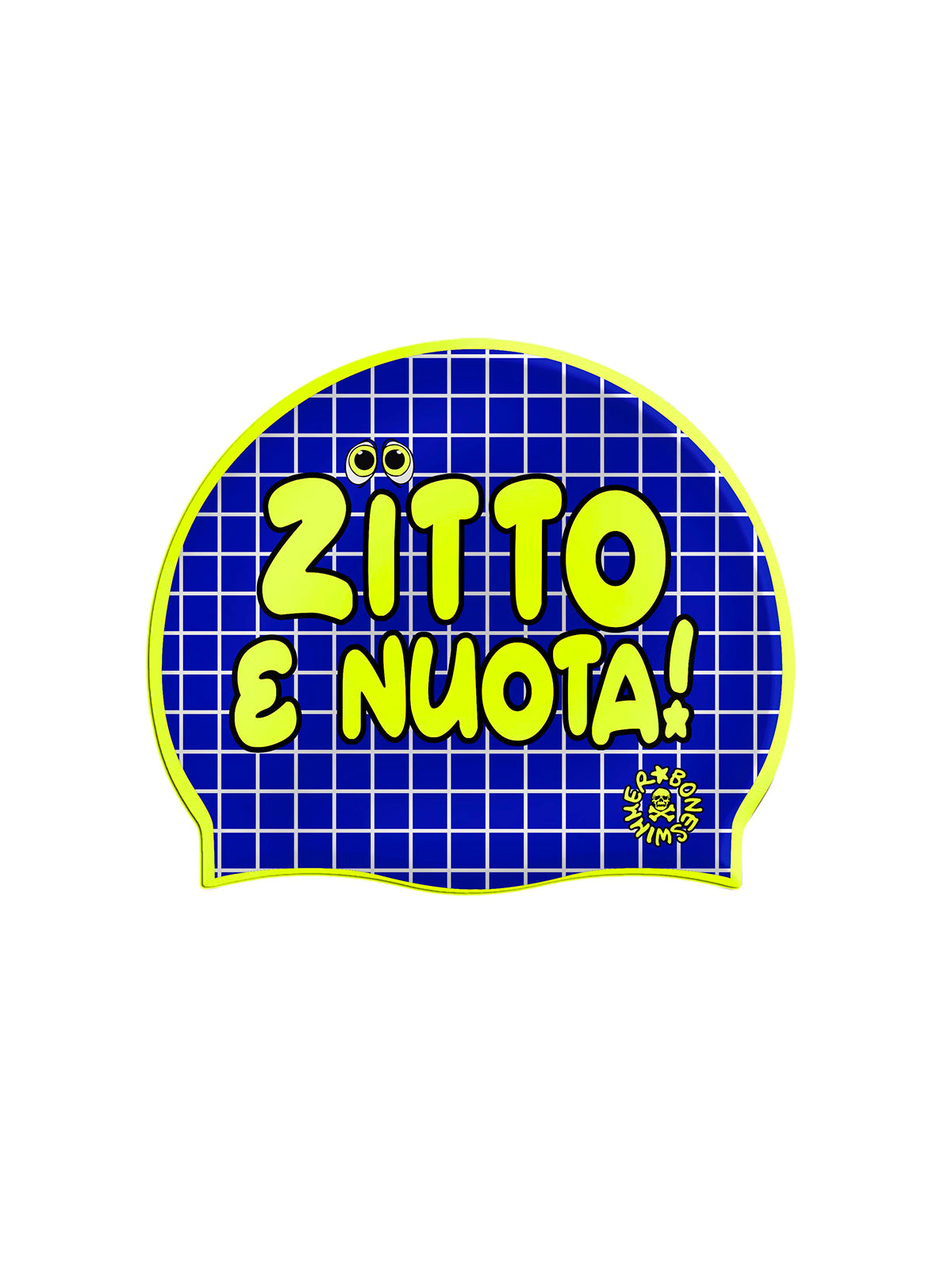 Estampado: una inscripción amarilla fluorescente "¡Cállate y nada!" sobre un fondo a cuadros