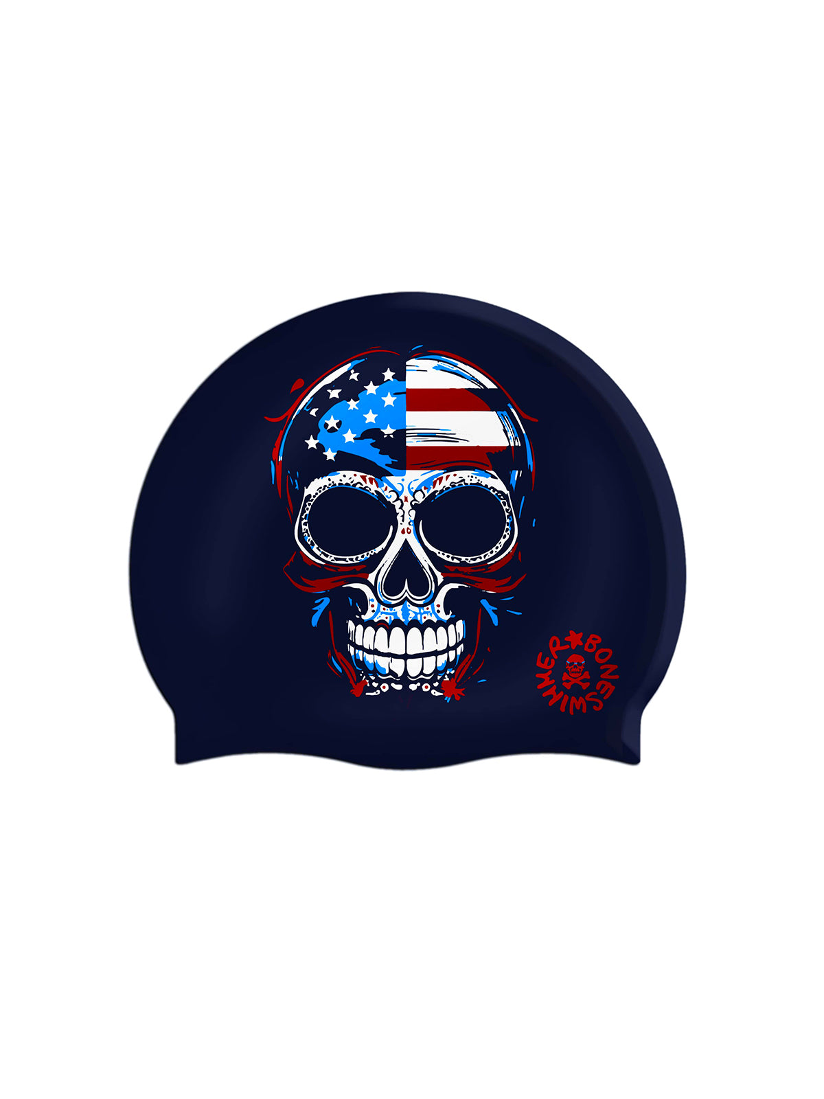 Estampado: un cráneo envuelto con la bandera americana se destaca cruelmente sobre fondo azul marino como advertencia a tus rivales de natación.