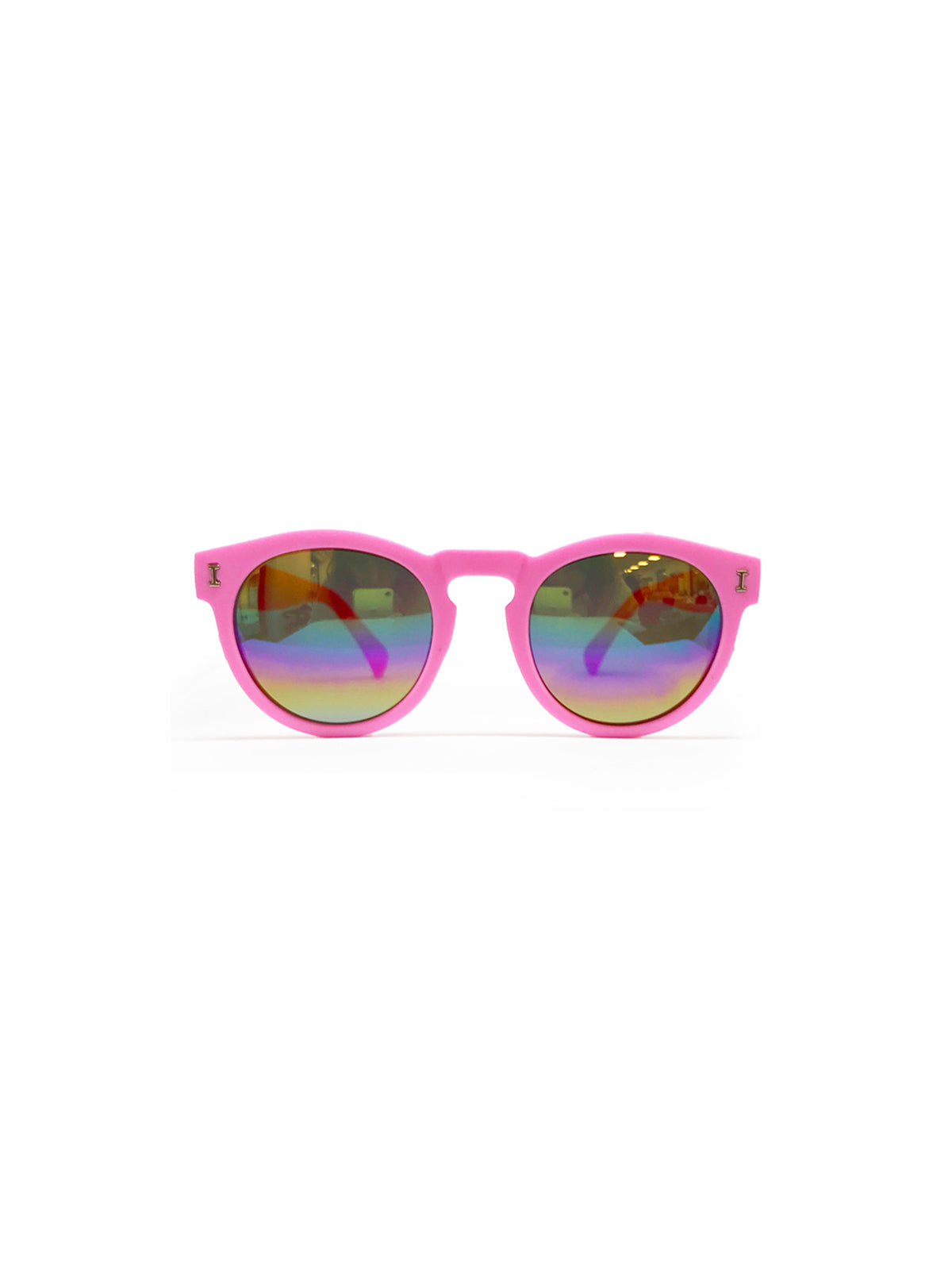 Gafas de sol con lente redonda espejada arcoíris y protección UV400. Tratamiento tacto suave en la montura.