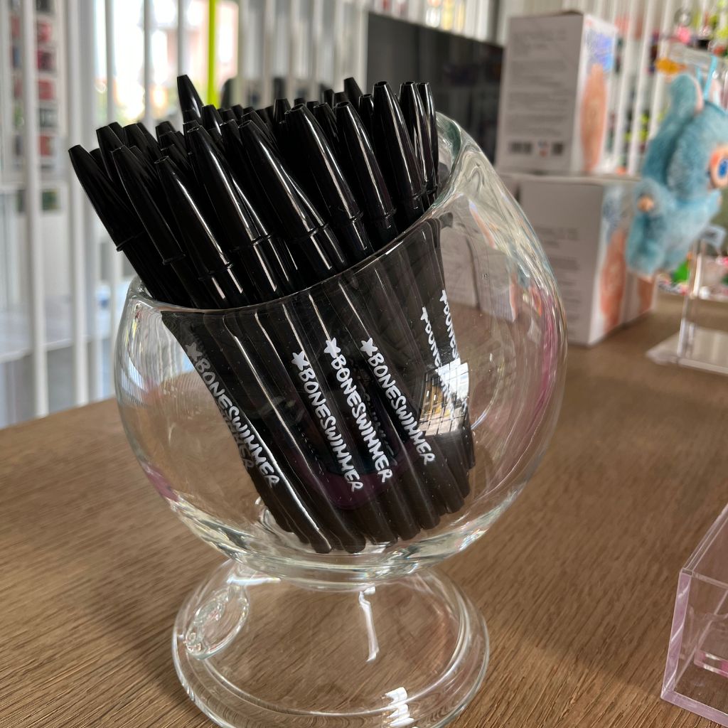 Bolígrafo Bic con cuerpo de plástico negro y logo serigrafiado Boneswimmer en blanco. Equipado con tinta azul a base oleosa para una escritura fluida y uniforme. Diseño ergonómico y ligero para un uso prolongado sin fatiga.
